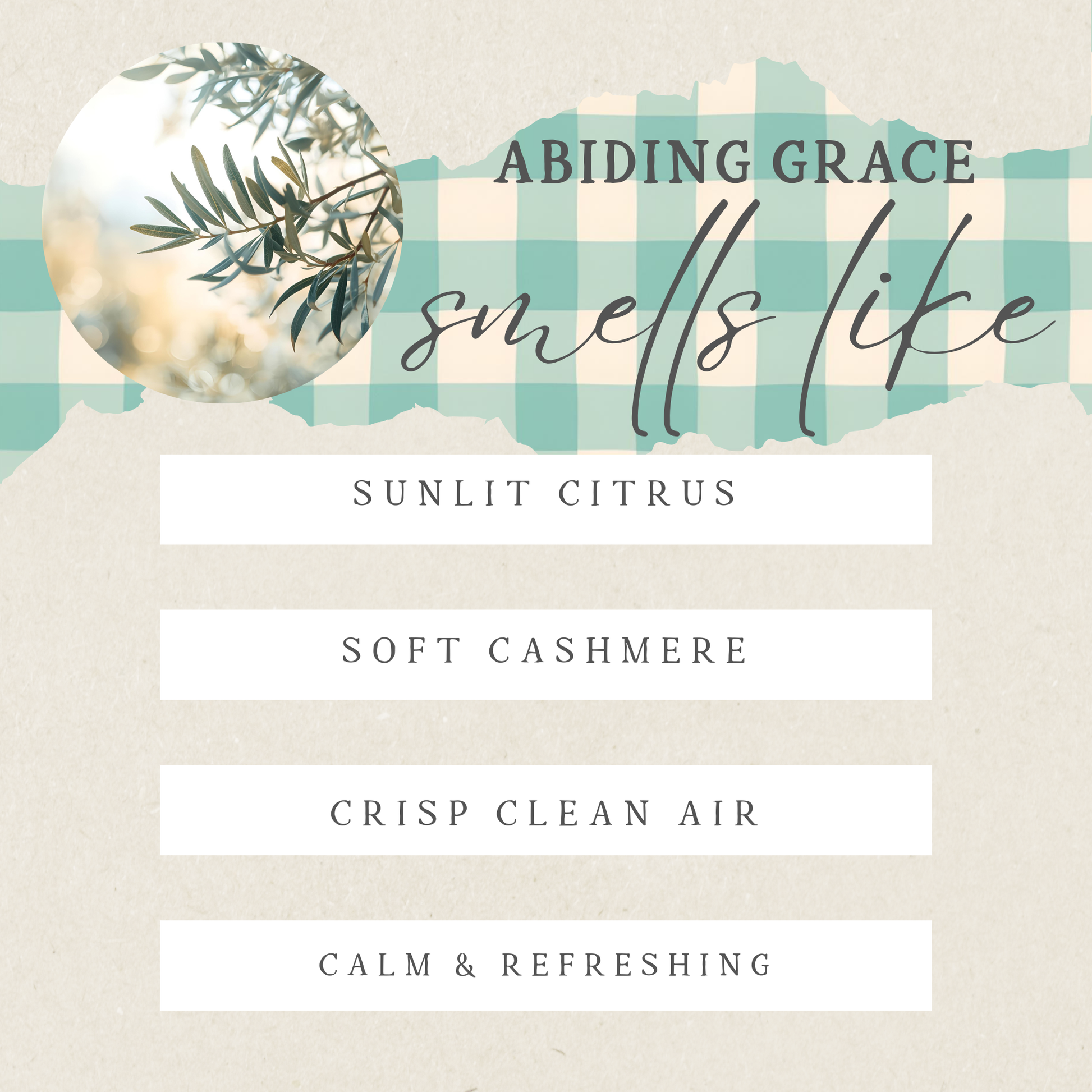 Abiding Grace is a fragrance created for quiet, restorative moments—a gentle pause in the middle of a busy day. Soft cashmere wraps your space in warmth, while sunlit citrus brings a subtle brightness, like morning light spilling through open windows. Crisp, clean air adds balance and clarity, creating a calm, refreshed atmosphere that encourages you to breathe and simply be.